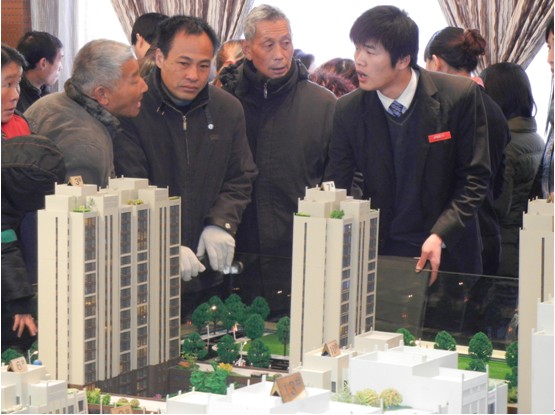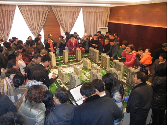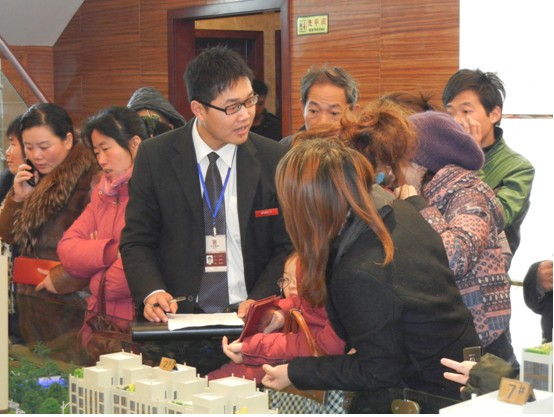 置業顧問在沙盤周圍解答客戶疑問,客戶圍滿了沙盤周圍,每個職業顧問都應接不暇。