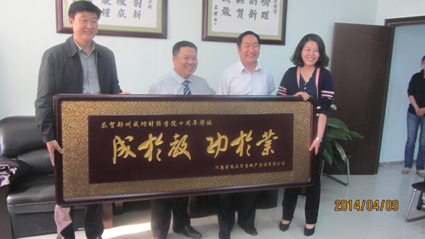 河南省尚正行房地產(chǎn)咨詢(xún)有限公司有幸與合作伙伴鄭州成功財(cái)經(jīng)學(xué)院共同慶祝成立十周年,和成功學(xué)院合作五年來(lái),學(xué)院每年都為我司輸送幾十名優(yōu)秀人才,至此已經(jīng)有近百名成功學(xué)院學(xué)子在我司任職,其中擔(dān)任公司要職的也大有人在,介于與成功學(xué)院的友好合作,在成功學(xué)院舉行十周年慶之際,我司代表副總王宏偉,人事總監(jiān)凌云英及成功學(xué)院在我司代表一行前往學(xué)院祝賀,并送去我司對(duì)學(xué)院的美好祝愿以及感謝,希望學(xué)院宏圖大展、越辦越好,也希望我們的合作能夠繼續(xù)順利,共同為社會(huì)作出自己的貢獻(xiàn)!