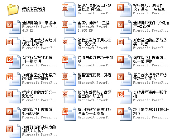 在首批次的金牌講師課件中,其所培訓的對象涵蓋了置業顧問、案場主管、案場經理、行政專員以及推廣專員等崗位。預期案場各個崗位的優秀員工,屆時均可以獲得相關專業知識的培訓。其中,部分員工的培訓課題如下圖所示: