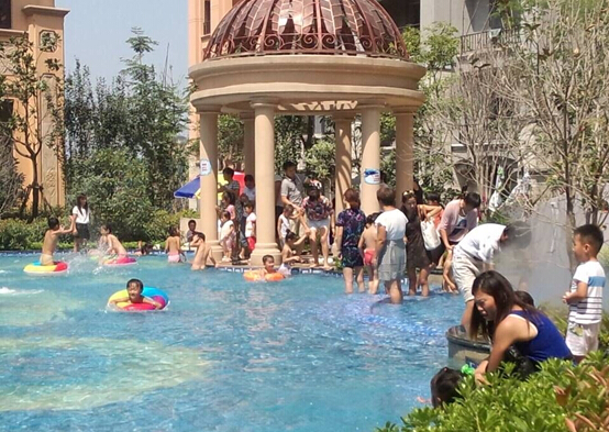景觀區(qū)里的游泳池成了小朋友的天堂,小朋友們個個欲想成為“游泳健將”在水里自由拍打,不時傳來天真無邪銀鈴般的笑聲。