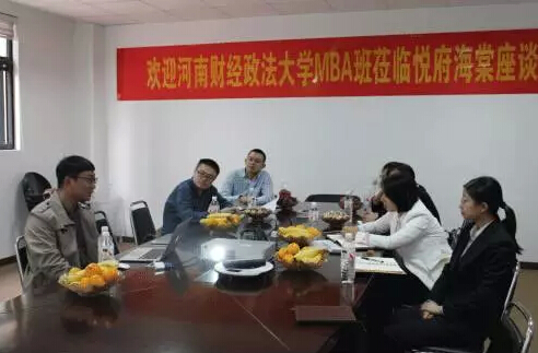 在此光環下,悅府·海棠被河南財經政法大學選為MBA班的營銷學案例,案場接到考察通知之后,便積極籌備財大高材生的接待工作。2015年10月24日下午,財大MBA班學員到訪悅府·海棠項目營銷中心,在悅府·海棠項目營銷總監王總的親自帶領下,學員們參觀了售樓部和項目工地,隨后在會議室聽取了項目匯報。