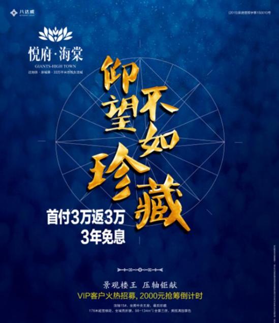 2016年,悅府·海棠珍藏鉅獻,封筆樓座15#耀世登場。176米超寬樓距,18項智能安防系統,通力電梯、步陽門等多種高端品質建材,筑造樓王非凡生活。景觀樓王,2000元認籌倒計時,98-134㎡全景三房四房,從容成就人生晉級。