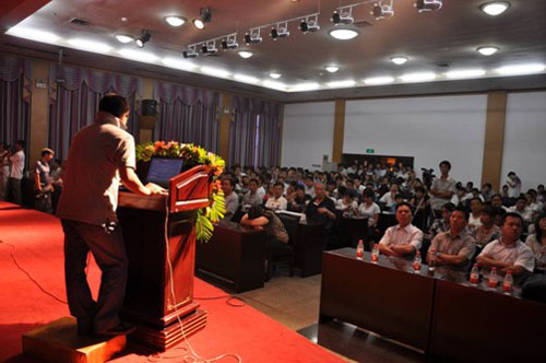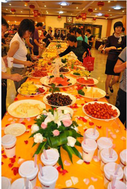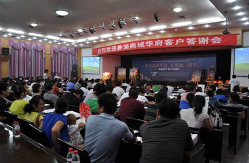 然而,等到下午5點鐘的時候,蜂擁而至的客戶已經打消了我們的疑慮,客戶的熱情并沒有因為下雨而被澆滅,客戶答謝會順利開始。尚城華府客戶答謝會的會場選在鞏義市最高級別的鞏義市賓館舉辦,會議正式開始前,為客戶準備了豐盛的冷餐酒會,到場的客戶先到餐廳就餐,然后再到位于三樓的會場參加產品說明會。